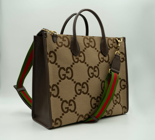GUCCI Maximalist Jumbo Brown Canvas Shopper - Aria Collection | GG Tote with Web Shoulder Strap