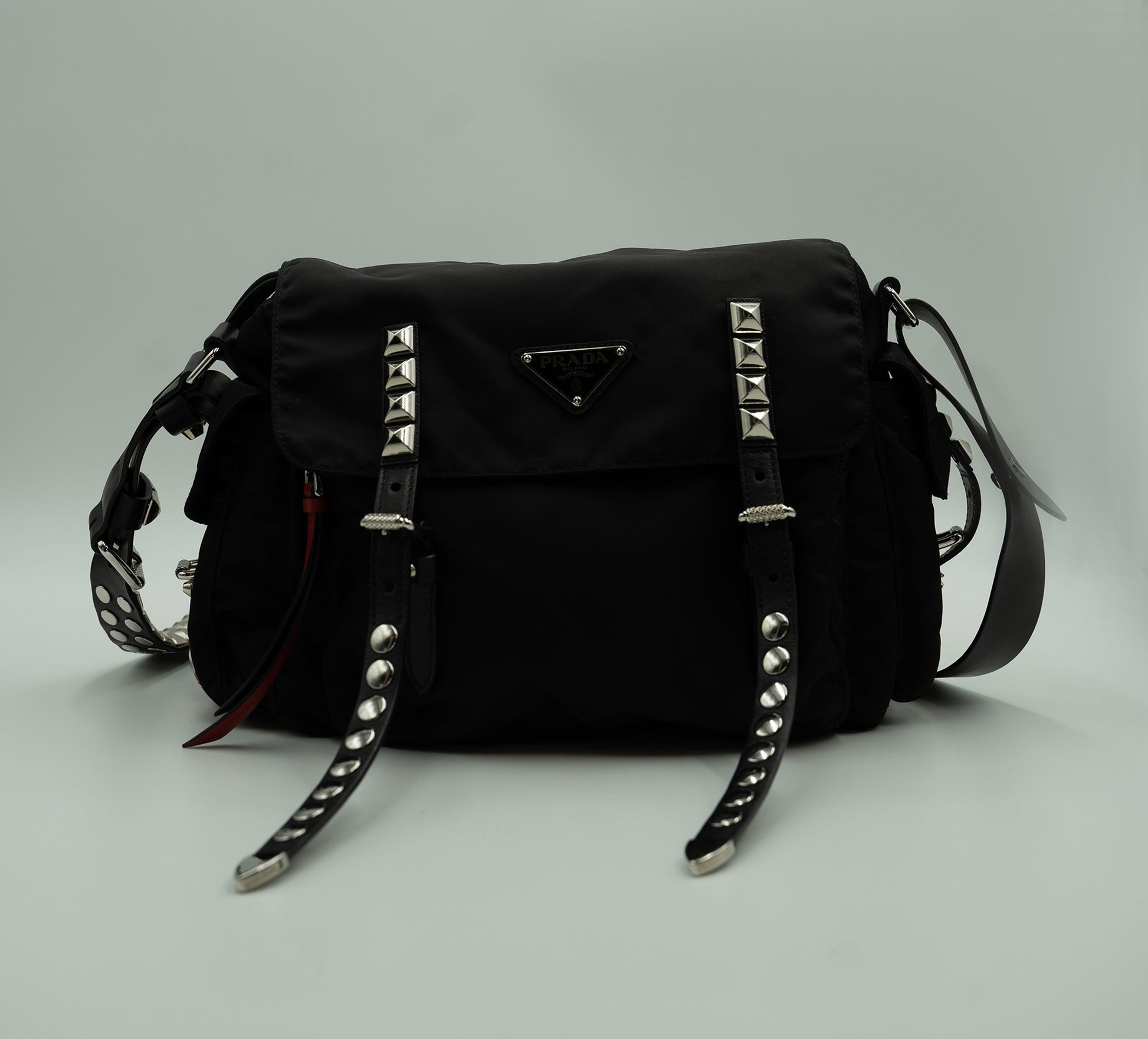 PRADA Black Nylon New Vela Studded Messenger Bag: Urban Style Meets Functionality"